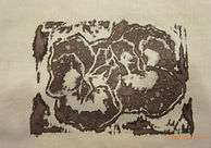 Réalisation de motifs à l'aide de pochoirs en rhodoïd et de tampons fabriqués par Mathilde. Les mordants utilisés pour l'impression sont à base de fer et d'alumine : ils se sont révélés après trempage dans la cuve de raisin.